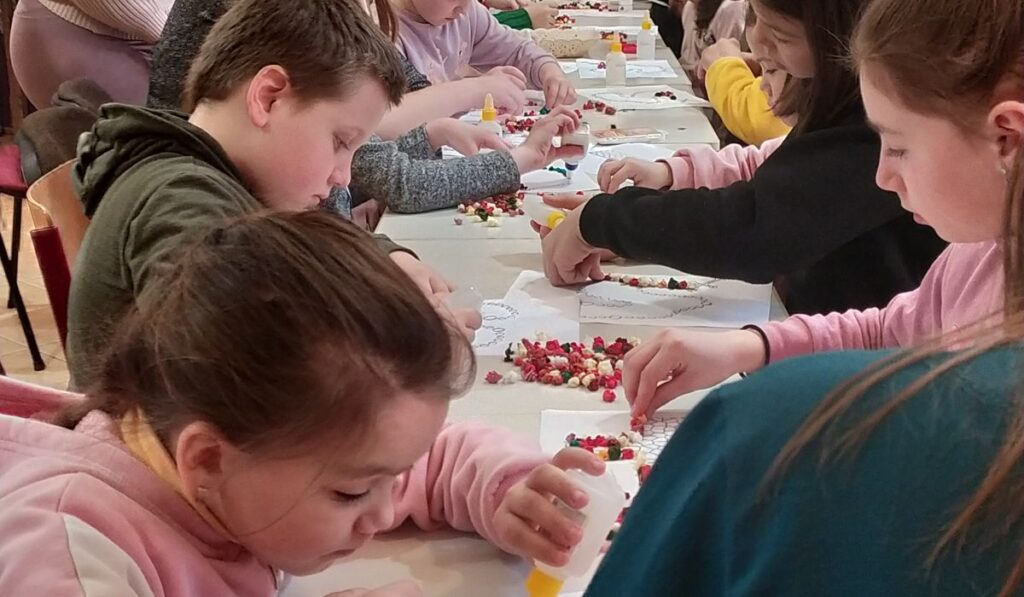 Egy kis uzsonna után kézműves foglalkozásra került sor. A gyerekek különböző színű golyókkal díszítették ki a lapokra nyomtatott kereszteket és rózsafüzéreket, melyek szintén a béke eszközei lehetnek ebben a háborús időszakban.