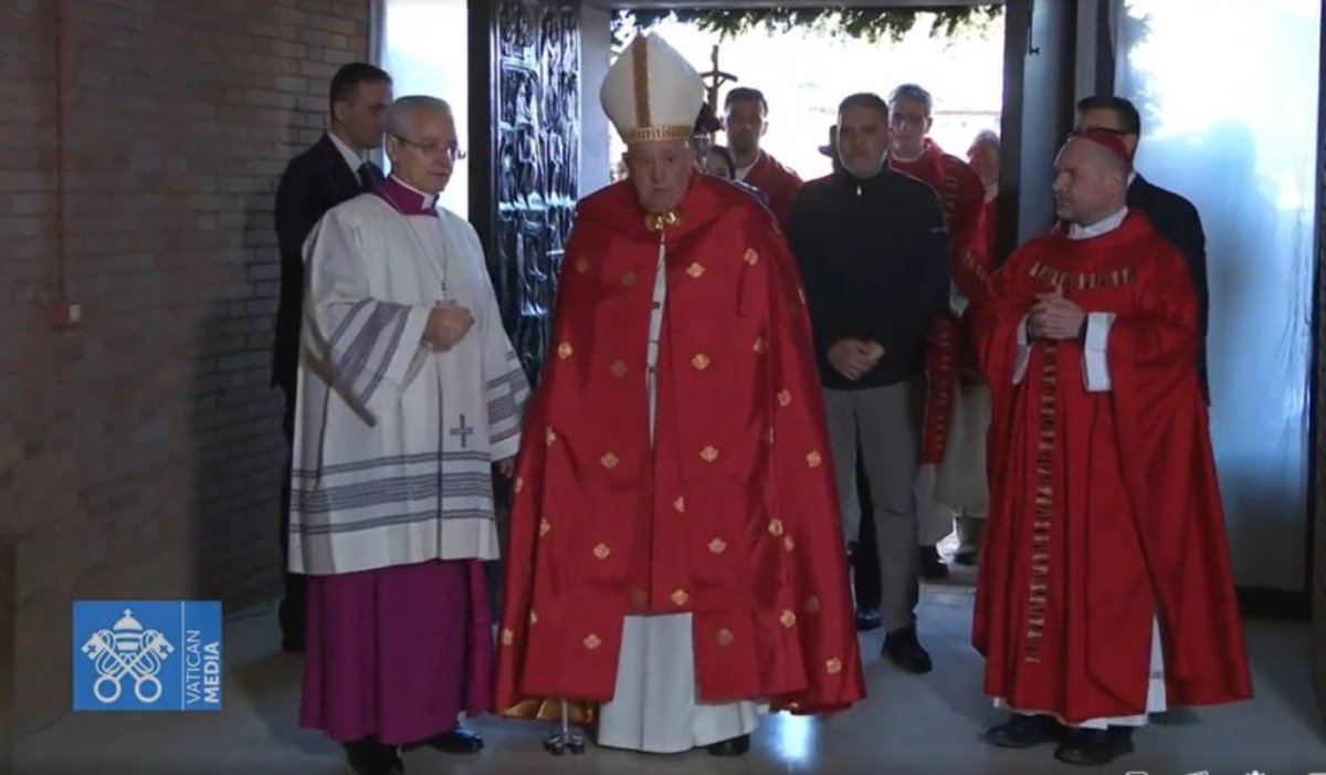 Ferenc a börtön udvarán álló Miatyánk-templom ajtaját tárta ki. A pápa kerekesszékkel érte el a kaput, majd Benoni Ambarus római segédpüspök segítségével felállt, megkopogtatta az ajtót, amely az érintésre megnyílt. Ezután misét mutatott be a templomban.