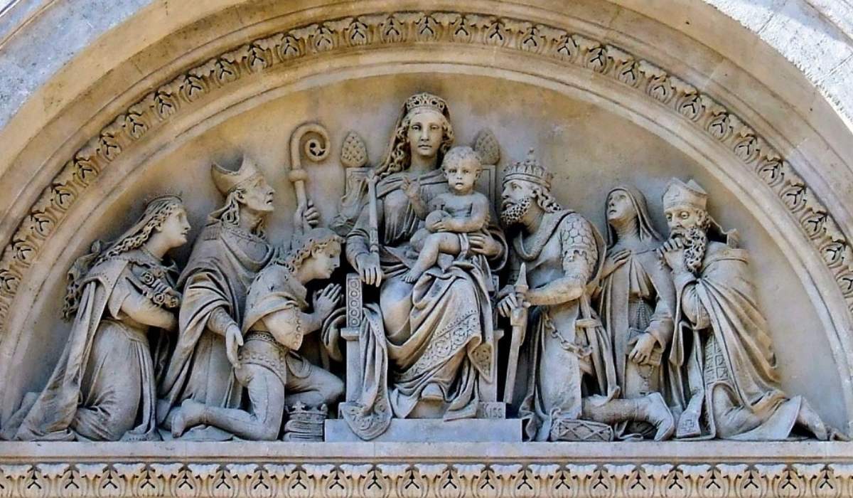 Fotó: Magyar szentek hódolata a Magyarok Nagyasszonya előtt, dombormű, Kiss György alkotása, Pécs (Fotó: Wikipédia)