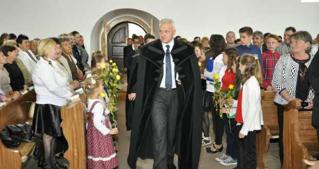 Már istentisztelet előtt nagy volt a készülődés: a kántorok – Kovács Sándor és felesége, Erika – által vezetett gyermekkórus és zenekar izgatottan hangolt, majd virággal kezükben sorfalat álltak, úgy fogadták énekszóval lelkészüket. S fennállva fogadta a gyülekezet is, közösen énekelve: „Ha visszanézek, a megtett útra…” Vers, zenés népi köszöntők, énekek, majd a következő meglepetés: a szószékre az egykori debreceni kollégiumi szobatárs, a barát, Kelemen Norbert (Magyarország) lépett fel. Aki igehirdetésében a Krisztus-követés fontosságát hangsúlyozta, ami elsősorban a hűségben nyilvánul meg. Arra figyelmeztetett, hogy ha Istent követjük, ha elfogadjuk a küldetést, nem tehetjük hiteltelenné Azt, Aki küldött. Húsz éve a csodák mezején jársz, fogalmazott a lelkész az ünnepelthez fordulva. Rád sok bízatott, s te nem ástad el az Istentől kapott tálentumokat, hanem használod azokat. Sok teher, gond nehezedik a válladra lelkészként, püspökként, de Ő erőt is ad a feladatok elvégzéséhez, s mindig kirendeli azt, amire szükség van. Olyan elődök nyomdokain haladsz, akik kinyitották az ajtókat, ezért hálát kell adnunk.
