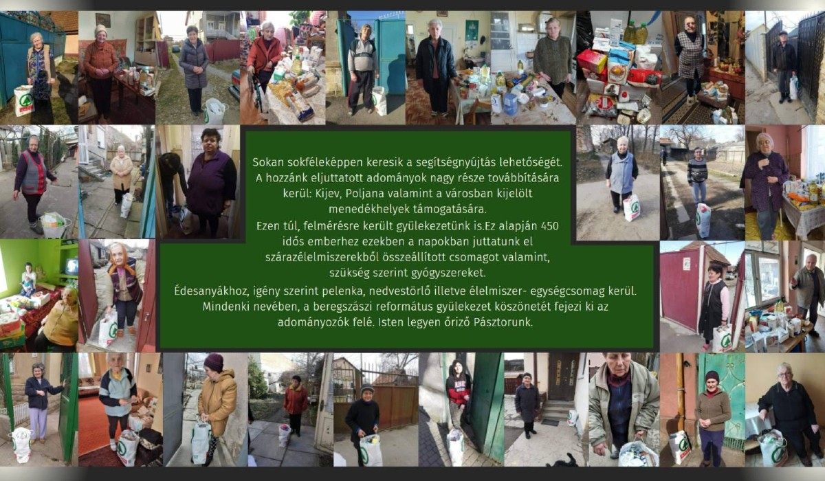 Számos csomag, gyűjtés érkezett a gyülekezethez, melyeket rendszerezve adományokat juttattak el egyrészt azokhoz, akik otthonaikat elhagyva itt, Beregszászban találtak menedéket, másrészt azokhoz, akik naponta át kell, hogy éljék fizikálisan is a háború borzalmait.