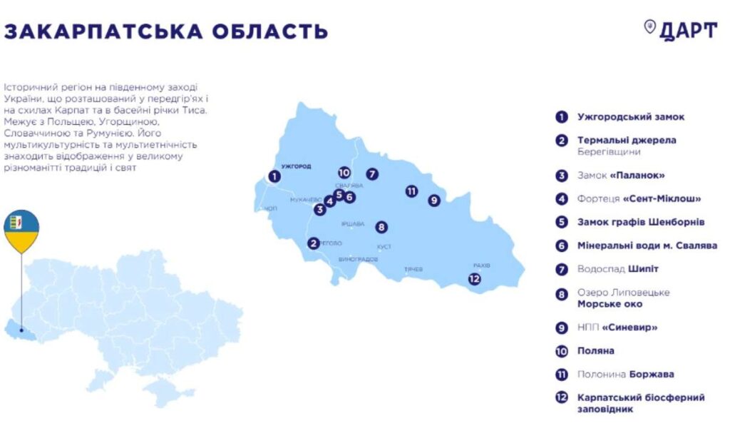 A térképre Kárpátaljáról az ungvári vár, a beregszászi termálfürdők, a munkácsi vár, a beregszentmiklósi várkastély, a Schönborn-kastéy, a Szolyva környéki ásványvizek, a Sipot-vízesés, a hárspataki tengerszem, a Szinevéri Nemzeti Park, Polena (Poljana), a Borzsa-havas (Polonina Borzsava) és a Kárpáti Bioszféra Rezervátum került fel.
