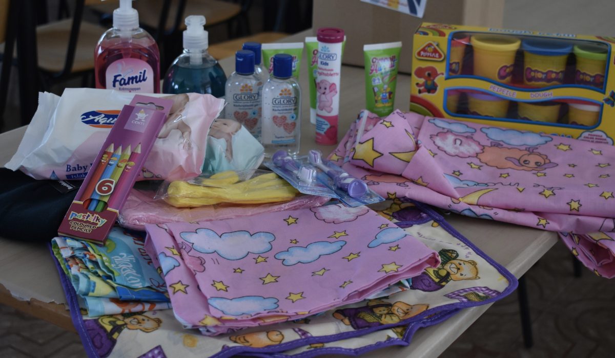 A gyerekek joghurtot és egy csomagot kaptak, amelyben higiéniai eszközök, játékok, ágyneműgarnitúra és egyéb hasznos dolgok vannak.