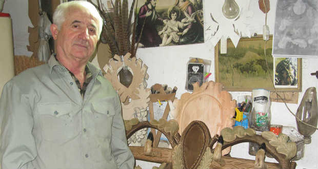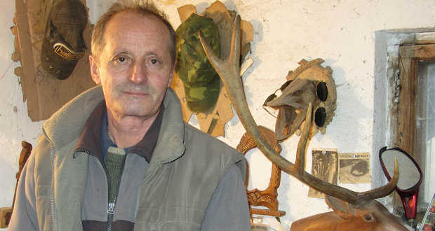 s faragott, sok dolgot megtanultam tőle. Bekerültem a kolhozba szuvenírezni. Egy műhelyben 20-25 ember is tevékenykedett. Sasokat, őzfejeket, ugró szarvasokat faragtunk. Még asszonyok is dolgoztak velünk. Ők nagyolták a sasok szárnyát, faragták az alátéteket. Két ember dolgozott együtt. Én például apámmal. Ő kinagyolta a fát, én pedig kifaragtam. Néha az asszony és a gyerekek is besegítettek a munkába, és fiatal fiúkat is betettek a műhelybe mellénk, akik akartak is dolgozni. Mi pedig tanítottuk őket. Az elkészített áru után adták a fizetést. Megrendelésre dolgoztunk, mindenki annyit csinált meg, amennyit csak bírt. Az apróbb méretűekből kellett mindig a legtöbb. Jól ment ez a munka. Jól lehetett vele keresni. És úgy megszoktam már, hogy akár 10 darab faragványt is meg tudtam csinálni egy nap egyedül. Azért tudtam gyorsan dolgozni, mert készítettem magamnak rövid késeket, amelyekkel könnyen lehetett bánni. A kés a fafaragó legfőbb szerszáma. Ha csak néhány percre mentem ki a műhelyből, már eltűntek a munkaasztalomról, mert addig, míg távol voltam, használatba vették őket a fiúk, a többi faragó. A munkák árának 25%-át kaptuk meg mi, 75% pedig maradt a kolhoznak. Egészen 1982-ig foglalkoztam faragással a kolhozon belül. Mostanában pedig trófeatartókat készítek, amiket preparált állatfejek alá rendelnek a vadászok. Ilyenből 50 centiméter szélességűt is készítettem már. Főleg vaddisznó-, őz- és szarvasfejhez kérik. Különböző méretű, formájú és mintájú trófeatartóim vannak. Ezeket mind magam találtam ki, magam terveztem és rajzoltam meg.