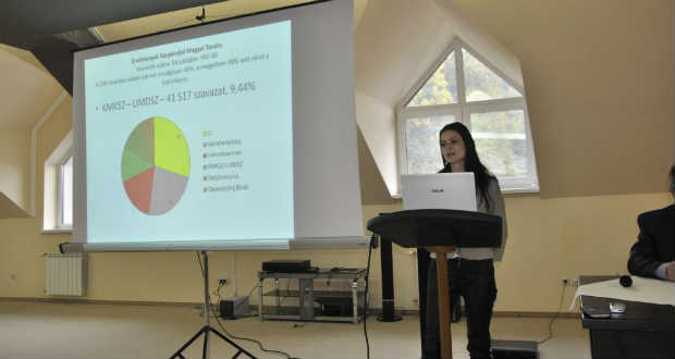 89011_2Elsőként Darcsi Karolina, a KMKSZ politikai titkára értékelte az önkormányzati választások eredményeit. Ismertette az új választási törvény kialakulásának folyamatát, melynek során három százalékról ötre emelték a bejutási küszöböt, megtiltották pártszövetségek indulását, és Brenzovics László módosító indítványait figyelmen kívül hagyva, nem voltak a nemzetiségek nyelvére lefordított szavazólapok sem. A választási körzeteket a törvénynek ellentmondva alakították ki, oly módon, hogy az hátrányos legyen a magyar közösség számára. Ezek az intézkedések és a nagymértékű kivándorlás tették szükségessé, hogy a két kárpátaljai magyar párt választási szövetséget kössön, ami jó döntésnek bizonyult. Megyénkben hozzávetőlegesen 80 ezer szavazásra jogosult magyar él, míg a magyar összefogás megyei listájára 41 517-en szavaztak; ez, figyelembe véve, hogy legalább 20 ezer kárpátaljai dolgozik jelenleg külföldön, jelentős győzelemnek tekinthető – hangsúlyozta Darcsi Karolina. A KMKSZ megyei listájára szavazott a kárpátaljai szavazók 9,44%-a, ennek köszönhetően nyolc képviselő jutott be a Kárpátaljai Megyei Tanácsba a magyar összefogás listájáról. A KMKSZ rendelkezik a legnagyobb frakcióval az Ungvári és Beregszászi Járási Tanácsokban. Sikerült bekerülnie a Szövetségnek az Ungvári, Munkácsi, Nagyszőlősi, Huszti Városi Tanácsokba, valamint a Munkácsi Járási Tanácsban is lesz négy képviselője a Szövetségnek. Beregszász városában az UMDP közös listája a szavazatok közel felét begyűjtötte, a 26 fős képviselőtestületben 12 mandátumot sikerült megszerezniük. 27, a KMKSZ által támogatott jelöltet választottak polgármesterré a megyében. Számítások szerint legalább 6-7 ezer magyar szavazott most is ukrán pártokra, de az eredményeknek köszönhetően a magyar szervezetek jelentős politikai tényezővé váltak a megyében – emelte ki a KMKSZ politikai titkára.