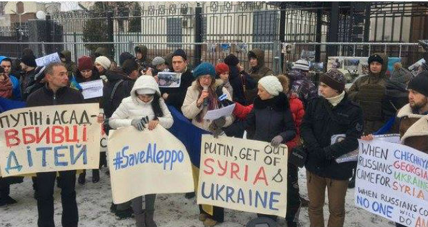 A szíriai Aleppó bombázása ellen tüntettek a kijevi orosz nagykövetség előtt