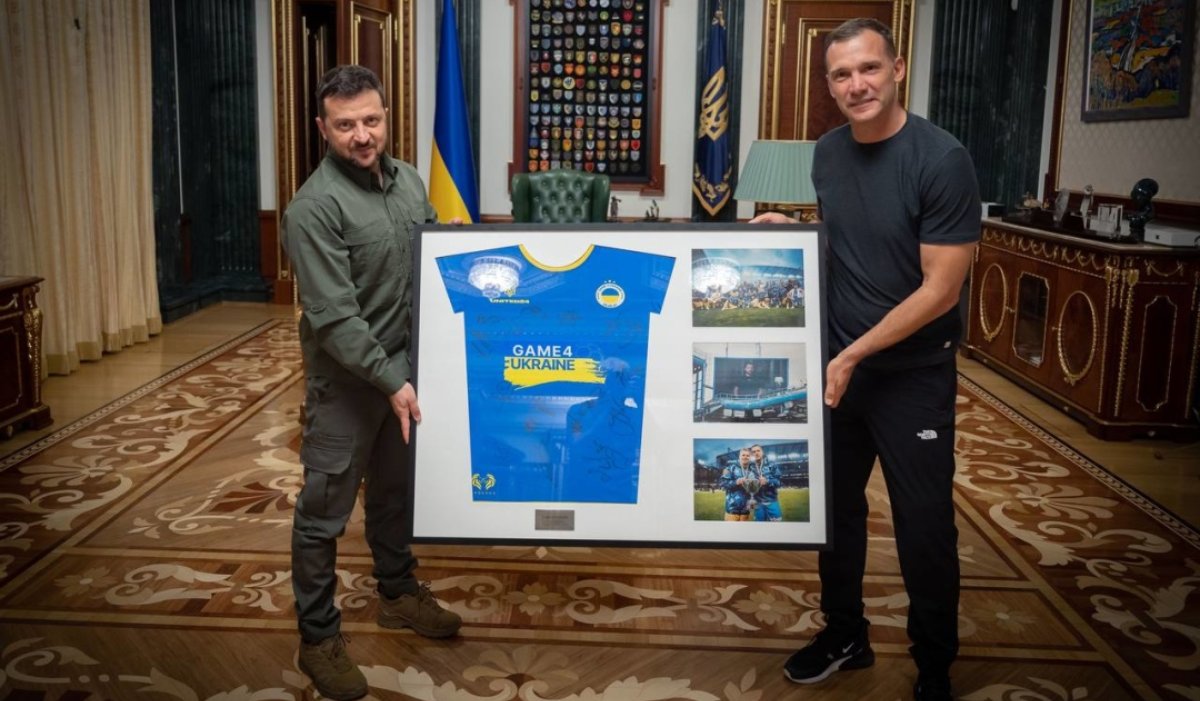 A bejegyzéshez csatolt fotókat is. Zelenszkij azt írta: „Találkoztam a United24 adománygyűjtő platform nagykövetével, Andrij Sevcsenkóval. A képen az augusztus 5-én, Londonban lezajlott Game4Ukraine jótékonysági mérkőzés játékosai által aláírt póló látható, amely a világ futballjának csúcssztárjait hozta össze.”