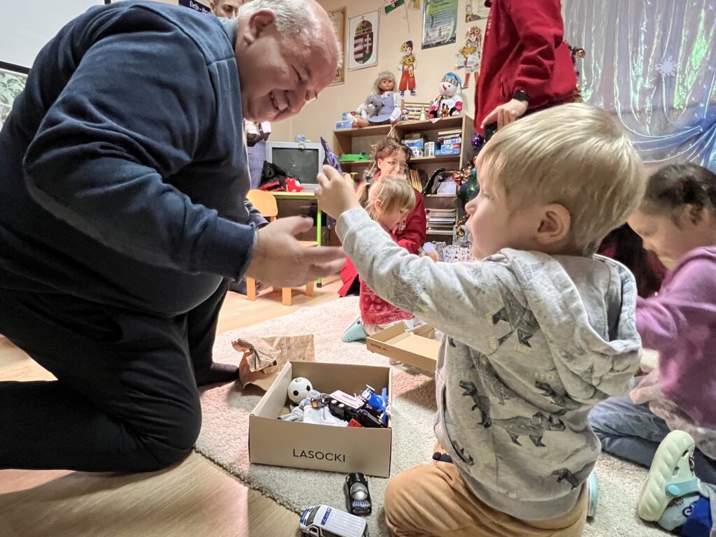 Jó volt látni, ahogyan a kisgyerekek percek alatt közvetlenséget és barátságot érezve, játszani hívták a karitász munkatársait. Écsy Gábor atya is boldogan segített egy kisfiúnak az ajándék kibontásában. Nehéz megmondani, hogy kinek esett jobban a játék: a gyerekeknek vagy az adományozó felnőtteknek. Kapni jó, de aki ad, annak is megtelik a szíve örömmel.
