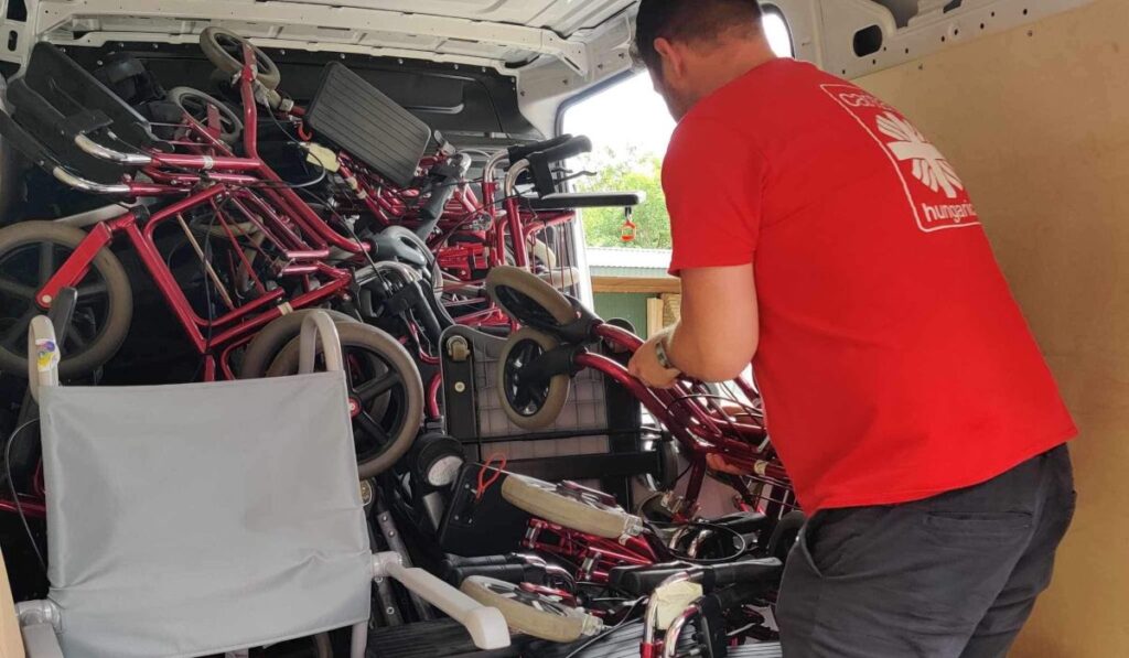 Összesen tizenöt vizsgálati ágyat, kerekesszékeket, mankókat és rollátorokat küldtek.