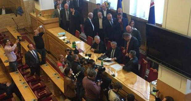 A kormányzó felháborodása, a megyei tanács vezetőjéről döntő szavazóláda eltulajdonítása és feltörése, valamint bombariadó színezte a Kárpátaljai Megyei Tanács mai alakuló ülését. Kedden lesz újabb tanácskozás.