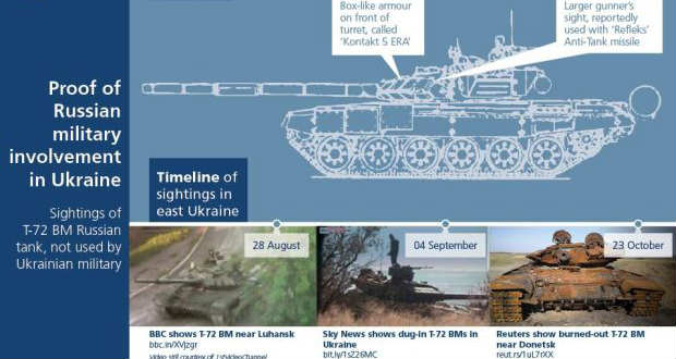Ezenkívül a nagykövetség közzétett három fotót, amelyeket a kelet-ukrajnai harcok övezetében készítettek T-72BM harckocsikról. A fényképek alatti szöveg szerint az első fotót a BBC hozta nyilvánosságra, Luhanszk mellett kaptak lencsevégre egy ilyen típusú harckocsit augusztus 28-án. A második a Skynews szeptember 4-i felvétele egy beásott harckocsiról, a harmadik pedig egy október 23-i, amelyet a Reuters hozott nyilvánosságra egy Donyeck mellett talált, kiégett T-72BM-ről.