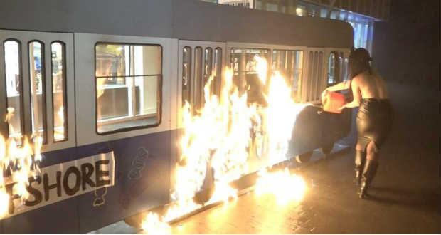 A villamoskocsira – mielőtt az aktivista felgyújtotta volna – „tram to offshore” (offshore-ba tartó villamos) angol feliratú papírszalagot ragasztottak. Az akcióval a Femen tiltakozását fejezte ki amiatt, hogy Petro Porosenko ukrán elnök neve is említésre került a legújabb offshore-botrányban, a Paradise-iratok (Paradise Papers) címen november elején nyilvánosságra hozott adatbázisban.