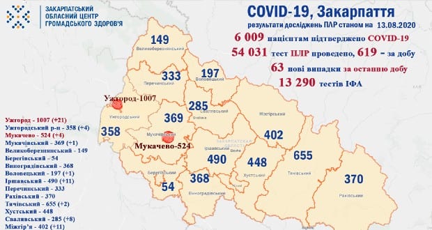 A Kárpátaljai Megyei Közegészségügyi Központ augusztus 13-i adatai szerint 63 koronavírussal fertőzött beteget regisztráltak az elmúlt 24 órában – tudatta a központ a közösségi oldalán.