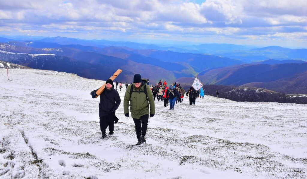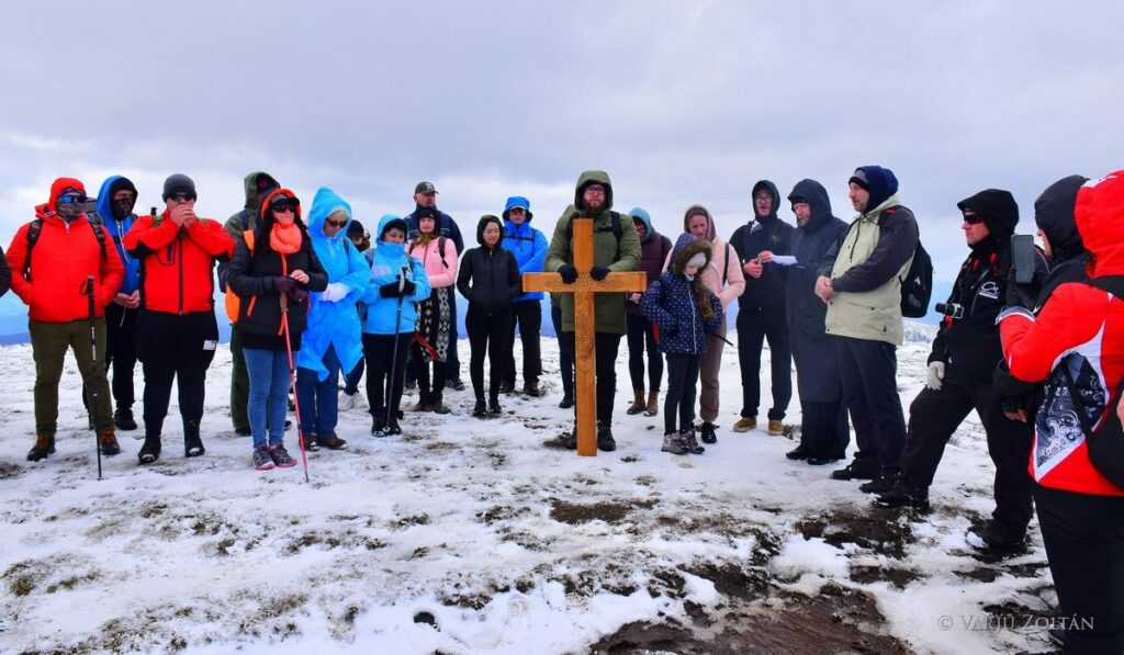 A közel hatórás gyaloglás alatt a tavaszi tájat téli, a napsütést köd, szélvihar és hóesés váltotta fel. Így érték el a túrázók a Firczák-havast, ahol Nílus püspök megszentelte azt a Tóth Gyula túratárs által készített faragott fakeresztet, amelyet a hegycsúcson állítottak fel. A jelenlévők közösen elénekelték a magyar himnuszt és elszavalták az egylet zászlajára hímzett Wass Albert sorokat. Itt adták át az új tagsági igazolványokat és a 10. túra megtétele után járó bögrét.