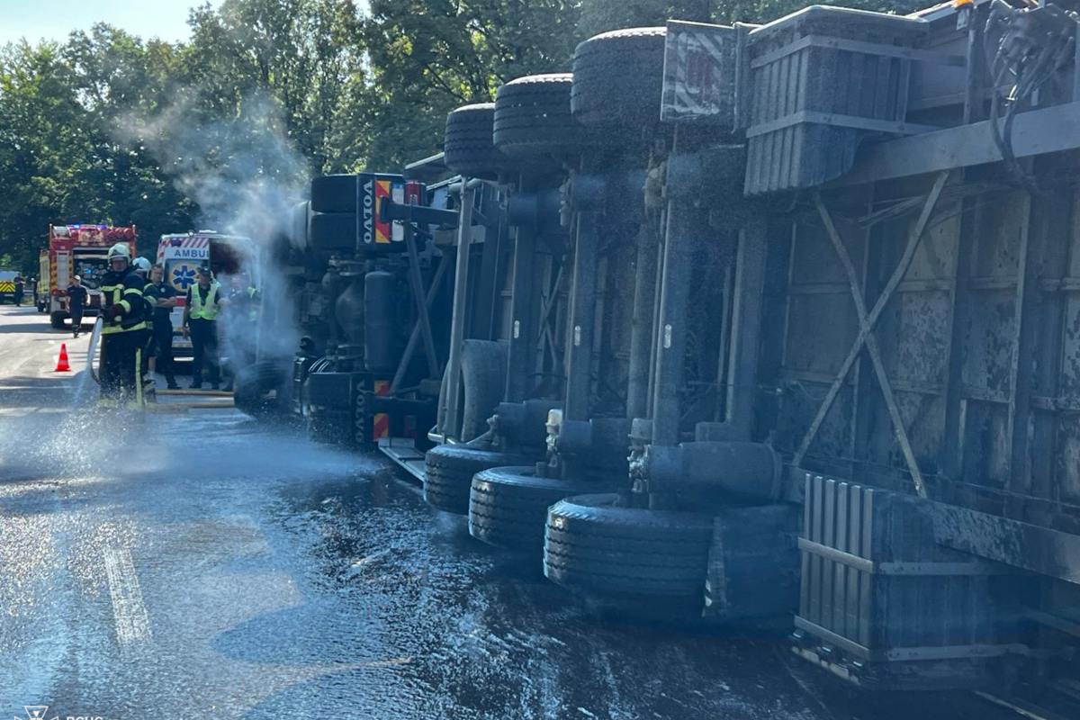 Egy Volvo márkájú kamion sofőrje elvesztette uralmát a jármű felett, majd felborult. A tartályból a gázolaj az útra ömlött.