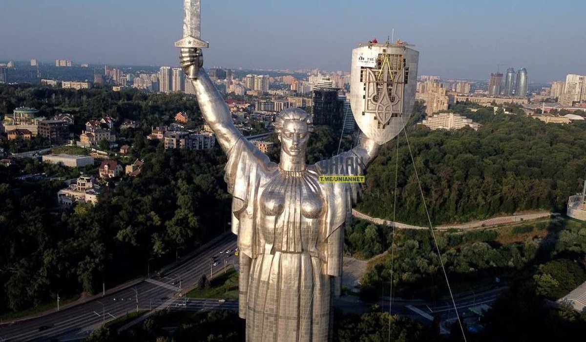 Az ukrán háromágú szigonyt reggel helyezték el a hatalmas nőalakot formázó acélszobor kezében tartott 13 méter magas és 8 méter széles pajzson. A sarlót és kalapácsot néhány napja szerelték le munkások az emlékműről, amelyet 1981-ben avatott fel Leonyid Brezsnyev egykori szovjet pártfőtitkár.