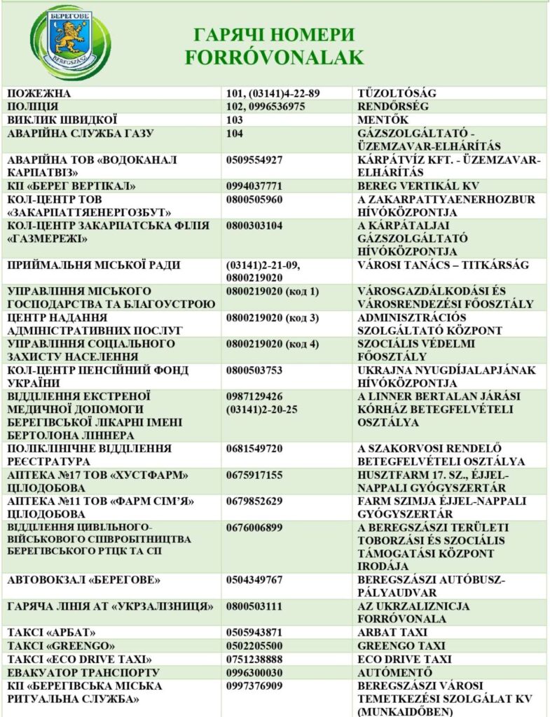A listán helyet kaptak továbbá az egészségügyi intézmények – köztük a beregszászi járási kórház betegfelvételi osztályának elérhetőségei –, valamint éjjel-nappal nyitva tartó gyógyszertárak telefonszámai is.