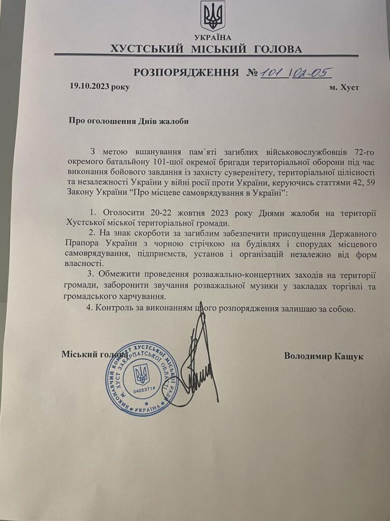 Volodimir Kascsuk polgármester rendelete értelmében gyásznapokat hirdettek a Huszti kistérségben október 20-22-e között.