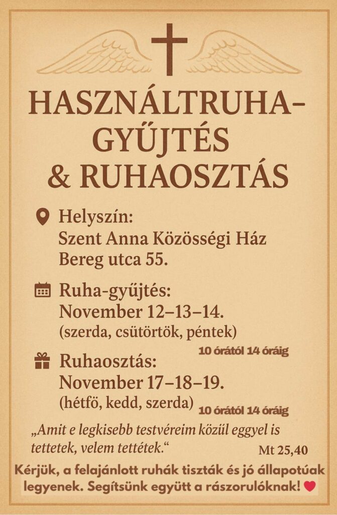 A Szent Anna Közösségi Ház (Csap, Bereg utca 55.) újra megszervezi hagyományos használtruha-gyűjtési és -osztási akcióját, amelynek célja, hogy segítséget nyújtson a rászorulóknak a téli időszak közeledtével.
