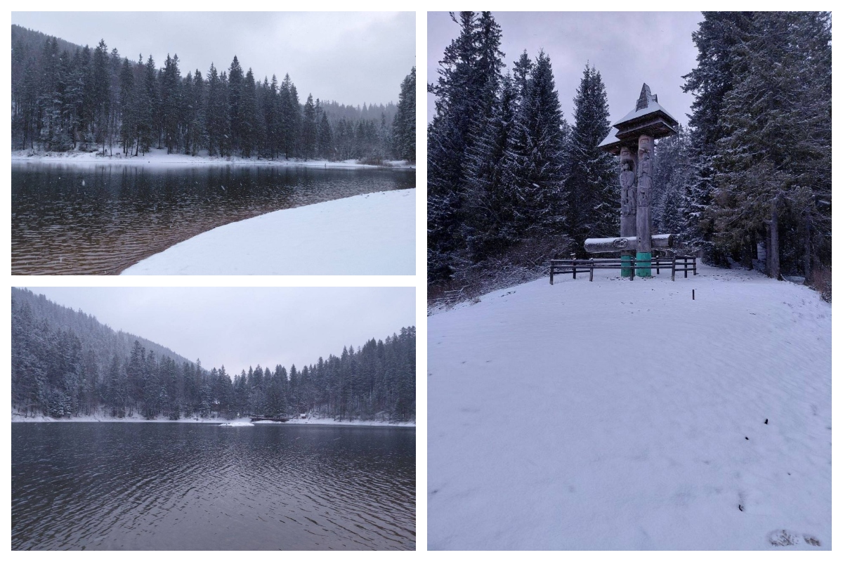 A naptár szerint már javában tart a tavasz, a Kárpátok magasabban fekvő vidékein azonban a tél még nem adta át teljesen a helyét az enyhébb időjárásnak. A Szinevéri-tó környékét friss hótakaró borította be, különleges látványt nyújtva az odalátogatóknak.