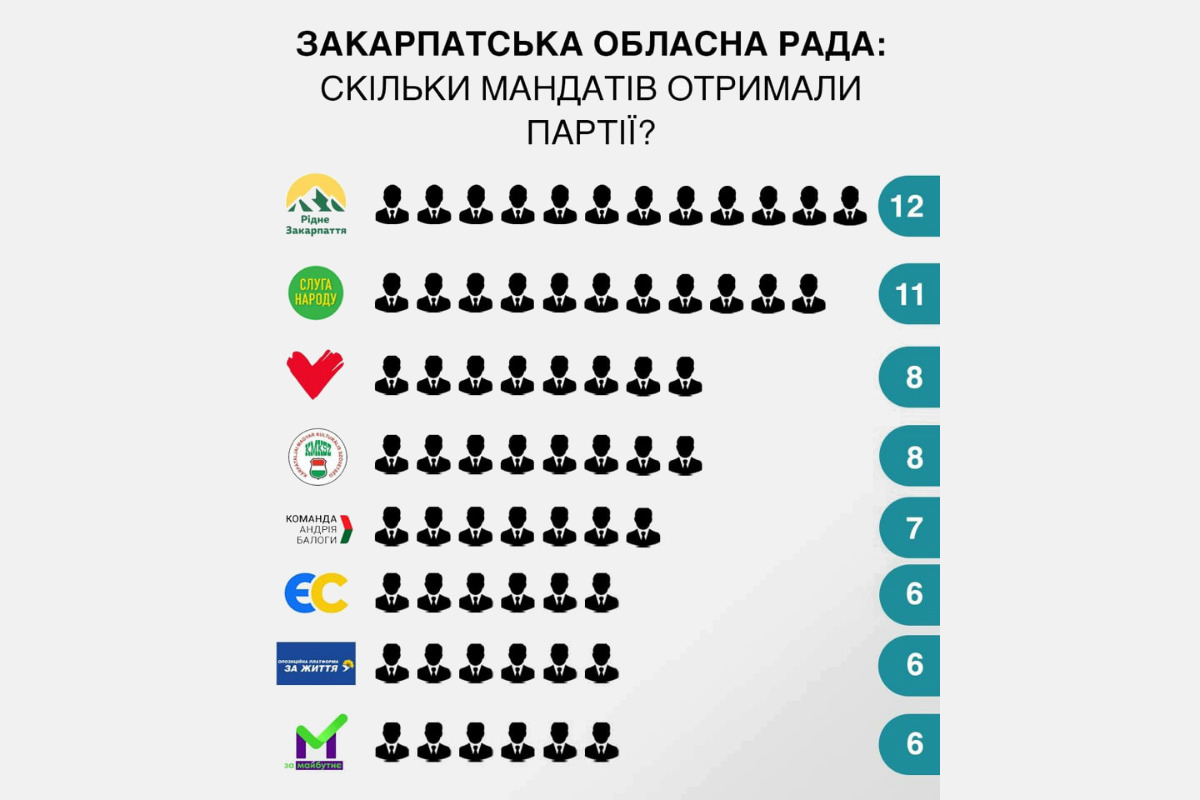 Az eredmények alapján a Ridne Zakarpattyának 12, a Szluha Narodunak 11, a Batykivscsinának 8, az Andrija Baloga pártjának 7, a Za Majbutnyének, az Európai Szolidaritásnak és az Ellenzéki Platform – Az Életért pártnak 6 képviselője lesz.