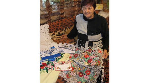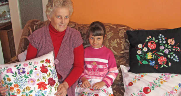 – Fiatalasszonyként kezdtem el ezzel foglalkozni. Láttam hímzett munkákat, és azt gondoltam, én is meg tudnám csinálni. Szülési szabadságon voltam, de szerettem volna pénzt is keresni. A faluból sokan kézimunkáztak a Filharmóniának. A csoportvezető adott nekem egy kis darab kirajzolt szalvétát, én kivarrtam, és kaptam is munkát. Kirajzolt mintájú ruhadarabokat, fellépő ruhákat kaptunk, pamuttal együtt, nekünk csak a hímzés volt már a dolgunk. Darab után kaptuk a fizetésünket. Határidőre dolgoztunk, sokszor egész éjjel a keresztszemes munkák fölött ültem. Külföldre, Amerikába, Németországba is kerültek munkáim. Magamnak is készítettem kézimunkákat, s ha közülük valakinek megtetszett valami, eladtam. Néhány éve én készítem a helyi iskolásoknak a ballagótáskákat. De nagyobb munkákkal már nem foglalkozom. A fiatalok pedig nem nagyon akarják megtanulni ezt. Sokan szépnek tartják a kézimunkákat, de drágának. Holott annyi munka van velük…
