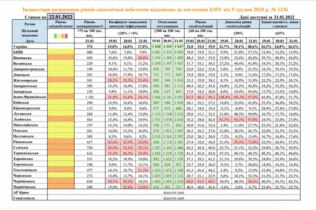 Frissítette Ukrajna Egészségügyi Minisztériuma az ország megyéinek karanténbesorolását január 22-én.
