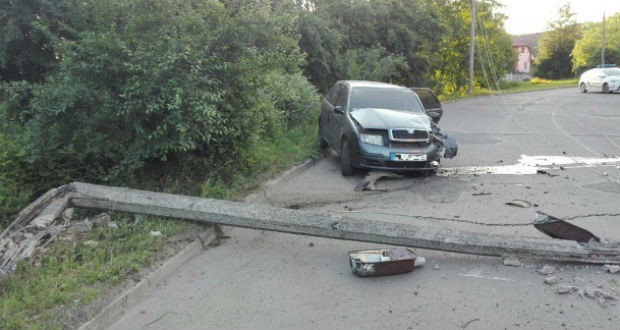 A Skoda márkájú személygépkocsi bal első része nagymértékben megsérült, a becsapódás következtében az autó kidöntött egy beton villanyoszlopot.