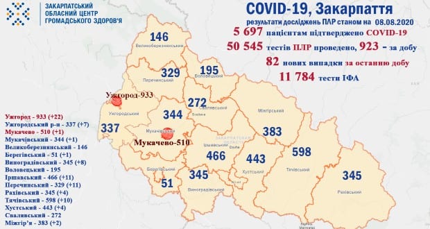 Koronavírus Kárpátalján – a Kárpátaljai Megyei Közegészségügyi Központ adatai szerint 82 fertőzöttet, 58 gyógyultat és 2 halottat regisztráltak Kárpátalján augusztus 7-én.