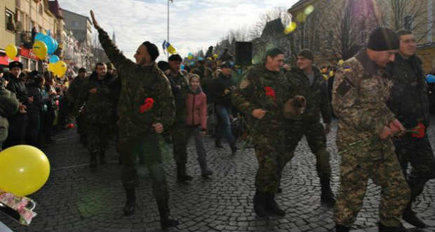 Munkács központjában hozzátartozók és barátok, megyei és egyházi vezetők fogadták az ország keleti részéről hazatérő kárpátaljai katonákat december 3-án.