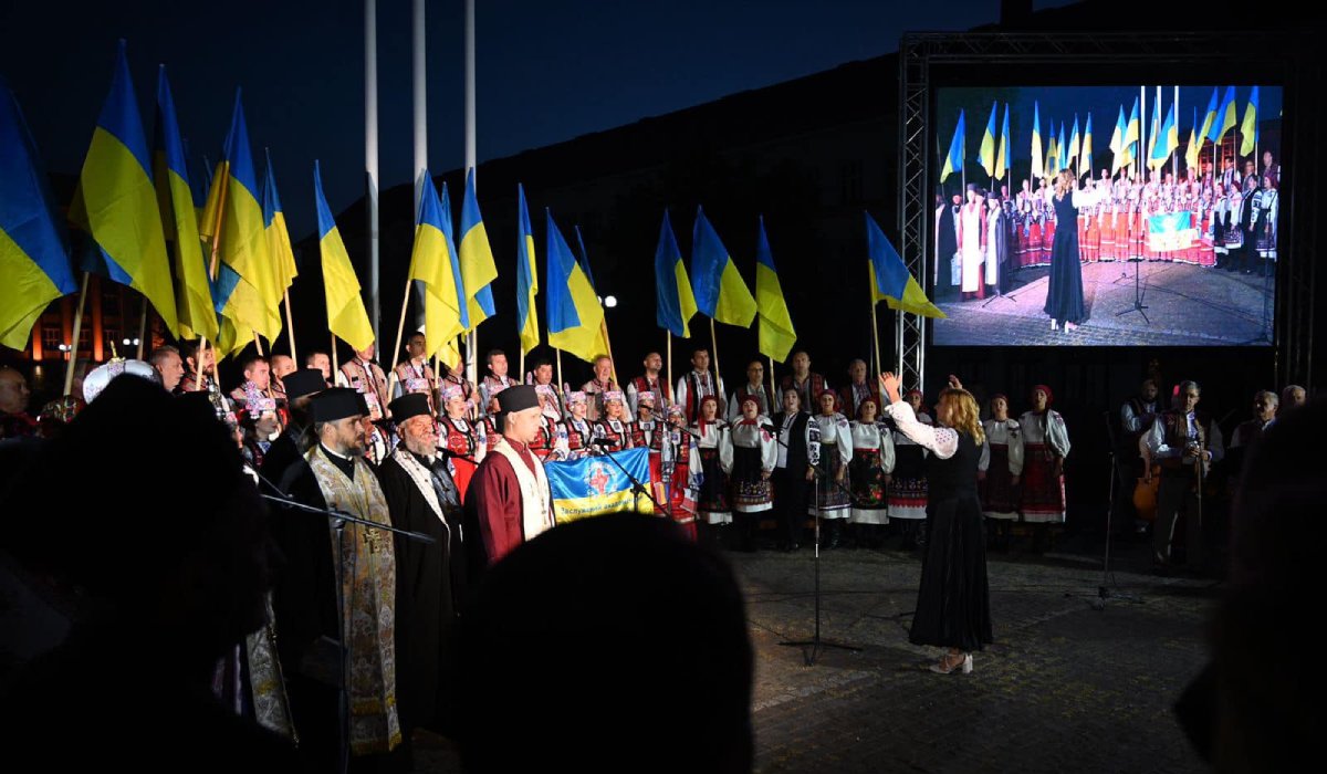 A felkelő nap első sugarai mellett a Kárpátaljai Megyei Érdemes Akadémiai Népi Kórus elénekelte az „Ima Ukrajnáért” című dalt, majd virágokat helyeztek el Tarasz Sevcsenko ukrán költő emlékművénél.