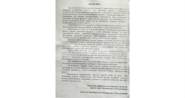 A fentieket figyelembe véve a Kárpátaljai Megyei Tanács képviselői az Ukrán Földkódex 122. cikkelyének módosítását indítványozták április 5-én, a VII. összehívású megyei tanács harmadik ülésszakának első ülésén.
