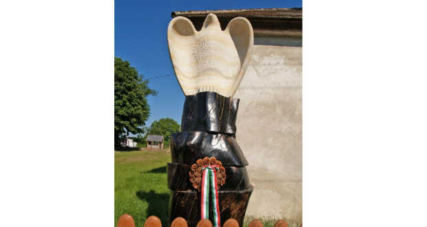 Egy homokkőből faragott kerecsensólymot, szárnyait félig széttárja, mint amikor fiókáit hívja szárnyai oltalma alá. Ha jól megnézzük, szív alakot formál, ez szimbolizálja a magyarok szívében élő szeretetet. Őrizze a turul szent királyaink földjét!”