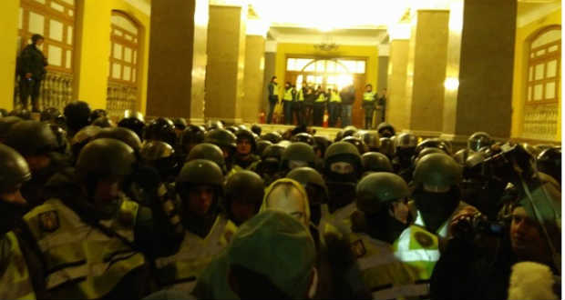 Az Ukrajinszka Pravda emlékeztet, hogy vasárnap az impeachmentről (az elnök elleni eljárásról) szóló törvény elfogadását sürgető menetet lezáró nagygyűlés után Miheil Szaakasvili, az Új Erők Mozgalma párt vezetője Kijev központjában bejelentette, hogy „koordinációs központot” rendeznek be az Insztitutszka utcában a Zsovtnevij palotában. Az akció résztvevői összecsaptak a karhatalmi erőkkel, behatoltak az épület halljába, ott azonban feltartóztatta őket a nemzeti gárda. Az összetűzések ideje alatt éppen koncertet tartottak az épületben.
