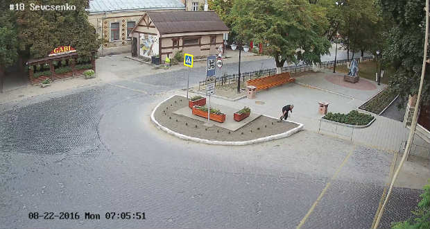 A polgármester által megosztott, a Bereg Video vállalat térfigyelő kamerája által rögzített felvételen jól látható, hogy egy férfi frissen ültetett tujafákat tulajdonít el a Sevcsenko parkból augusztus 22-én.