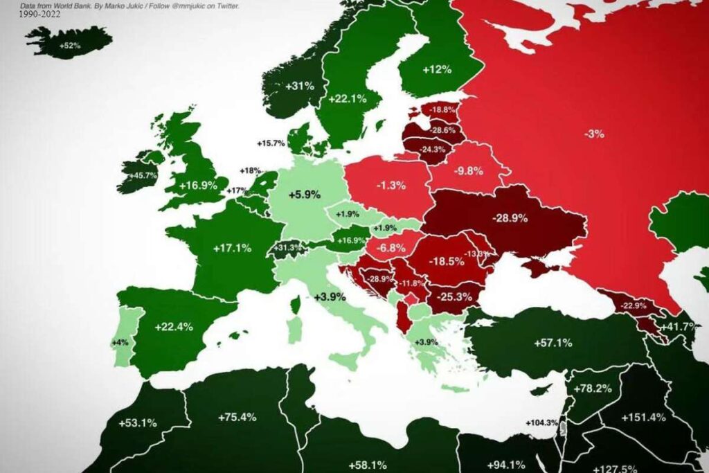 Közzétették a közösségi hálón Európa, Észak-Afrika és Nyugat-Ázsia népességének változását 1990-től 2022-ig. Az adatok szerint 32 év alatt Ukrajna elveszítette az ország lakosságának csaknem 28,9 százalékát.