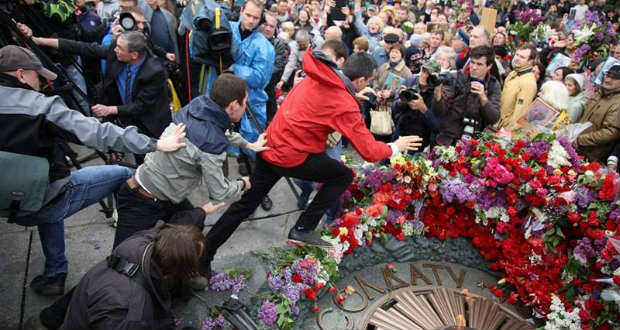 Krumplik, tojások, füstbombák, festékkel teli lufik és botok repültek ki az Ukrán Nacionalisták Szervezetének (OUN) kijevi irodájából kedden a győzelem napi oroszbarát menet résztvevőire, illetve az eseményt biztosító rendőrökre és a helyszínről tudósító újságírókra.