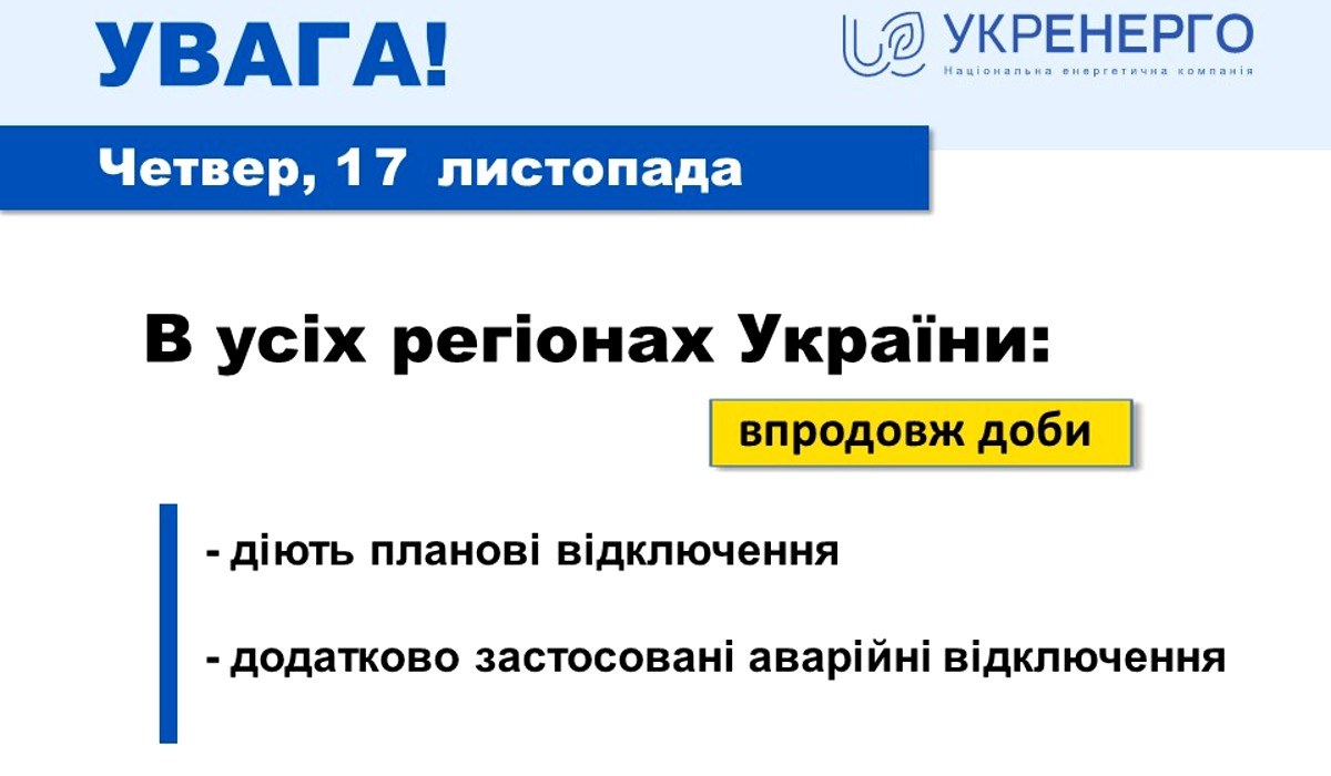 Mint írják, az óránkénti áramszünetek és vészleállások csütörtökön is érvényben lesznek. A hideg idő miatt megnőtt az áramfogyasztás az egész országban. Ez tovább terheli a villamosenergia-hálózatot. Ezen kívül a november 15-ei nagyszabású rakétatámadás az energetikai infrastruktúra ellen tovább bonyolítja a helyzetet. Ez az intézkedés elengedhetetlen az energiarendszer stabilitásának megőrzéséhez – közölte az Ukrenergo.