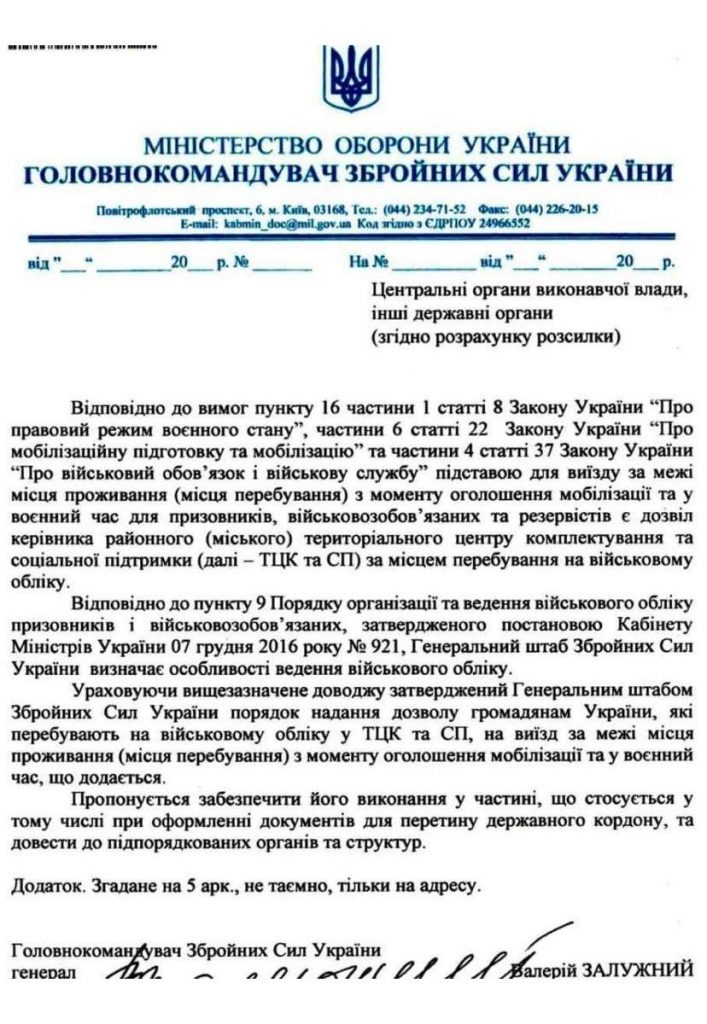 az 1992 óta hatályos, katonai szolgálatról szóló ukrán törvény kimondja, hogy hadiállapot idején tilos a sorkatonáknak, hadköteleseknek és tartalékosoknak elhagyni lakóhelyüket a területi központ vagy a hadkiegészítő parancsnokság illetékes vezetőjének engedélye nélkül.