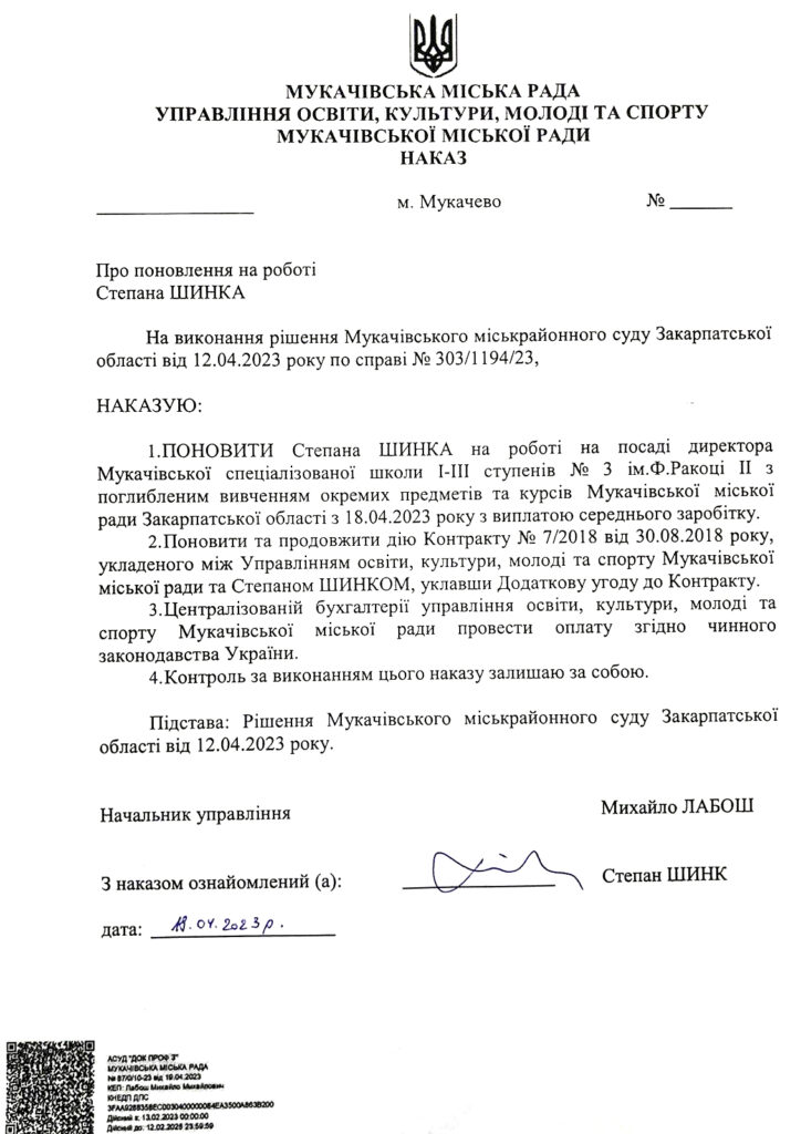 A Munkácsi Járási Bíróság azonnali hatállyal visszahelyezte posztjára Schink Istvánt, a Munkácsi II. Rákóczi Ferenc Középiskola menesztett iskolaigazgatóját − tudatta az oktatási intézmény.
