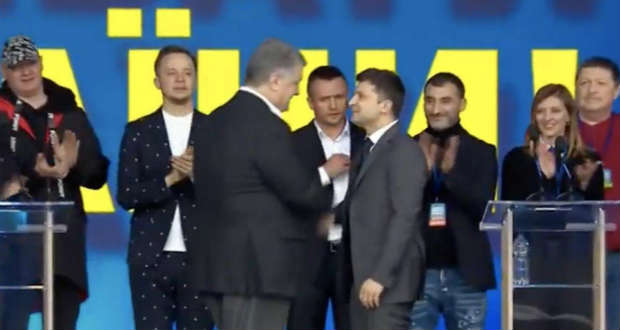Zelenszkij azzal replikázott, hogy életében nem találkozott Putyinnal, míg ezt Porosenko százszor megtette korábban. Az elnökváltásra készülő jelölt korábban közösségi oldalán, a lakosoktól gyűjtött kérdéseket szegezte Porosenkónak. Utóbbi csak a hazafiasságra próbált apellálni. Nem igazán volt más ütőkártyája, minthogy Kolomojszkij orosz oligarcha, valamint Putyin bábjának nevezze Zelenszkijt.