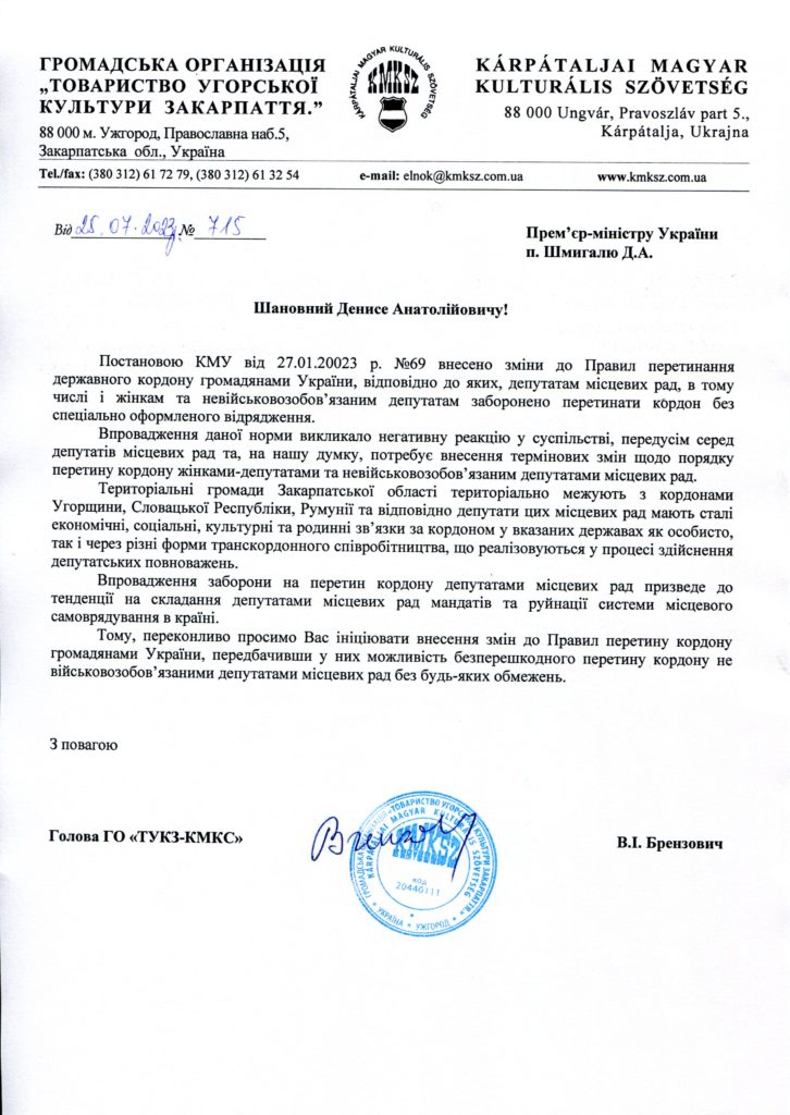 Levélben fordult Denisz Smihal ukrán miniszterelnökhöz a Kárpátaljai Magyar Kulturális Szövetség, amelyben annak a határozatnak a visszavonását kérik, mely a képviselők kiutazását korlátozza. Az Ukrajna Miniszteri Kabinetje 2023. január 27-én elfogadott 69. számú határozatában módosították a határátlépési szabályokat az ukrán állampolgárok számára. Ennek értelmében nem utazhatnak külföldre a helyi tanácsok képviselői, beleértve a nőket és a hadkötelesség hatálya alá nem tartozó képviselőket. Míg korábban csak a hadköteles férfiak és a katonai szolgálatot teljesítő nők számára volt tilos külföldre utazni, egy éve már a civil nők bizonyos kategóriáira is vonatkozik a tiltás: a köztisztviselőkre és a tanácsi képviselőkre.