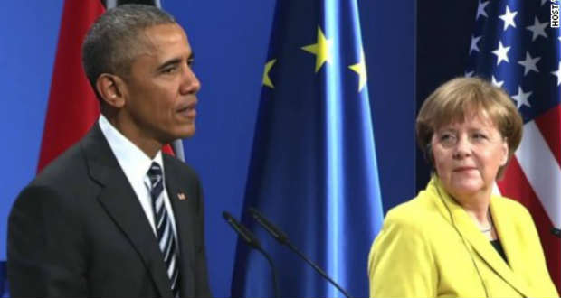 A részben négyszemközt folytatott megbeszélés elhúzódása miatt a kancellária által előre jelzett időpontnál több mint fél órával később kezdett és rendkívül hosszú, csaknem 70 perces sajtótájékoztatón Angela Merkel kiemelte: a transzatlanti együttműködés folytatása azért is fontos, mert társadalmilag fenntartható, „emberi” mederbe kell terelni a globalizáció folyamatát. Ugyanakkor jelezte, egyelőre nem lát lehetőséget arra, hogy a közli jövőben tető alá hozzák a tervezett transzatlanti szabadkereskedelmi megállapodást (TTIP).