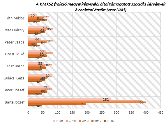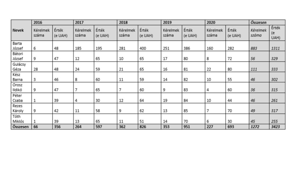 – Sajnálatos módon sokkal több rászoruló van, mint ahányat módunkban áll támogatni, ez mindenki számára nyilvánvaló. Azonban örvendetes, hogy a legutóbbi önkormányzati választásokat követően létrejött magyar frakciónak sikerült eredményesen felhasználni a rendelkezésre álló összeget. A számok nyelvére lefordítva: a 2016-2020-as ciklusban összesen 3 millió 423 ezer hrivnya értékben tudtunk támogatásban részesíteni 1 272 kérelmezőt. Ez is mutatja azt, hogy több más szemponton túl a támogatási források elérése miatt is fontos a jó választási eredmény, valamint az ebből és a politikai alkukból fakadó érdekérvényesítési lehetőségek kihasználása. Az első időszakban az elosztható források növekedtek, később a gazdasági helyzetből fakadóan némileg csökkentek. Az összes támogatottak száma 2017-ben nőtt a legintenzívebben, ekkor meg tudtuk négyszerezni, majd a következő évben 362 támogatottal értük el a maximumot (37%-kal nőtt az előző évhez képest), majd 2019-ben néhány fős visszaesés volt. 2018-ban tudtuk a legtöbb támogatást adni, 826 ezer hrivnya értékben.