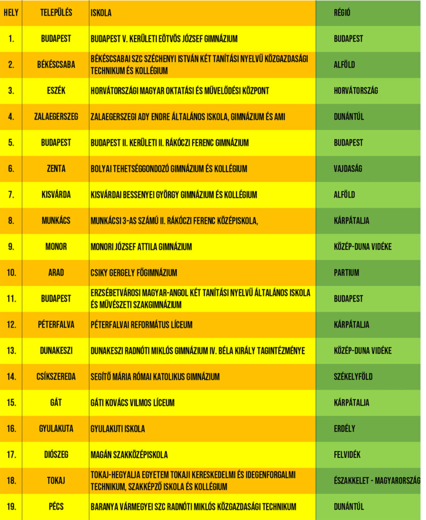 A verseny első helyezettje az Eötvös József Gimnázium (Budapest) lett, a második helyezett a Békéscsabai SZC Széchenyi István Két Tanítási Nyelvű Közgazdasági Technikum és Kollégium (Békéscsaba), a harmadik a Horvátországi Magyar Oktatási és Művelődési Központ (Eszék).