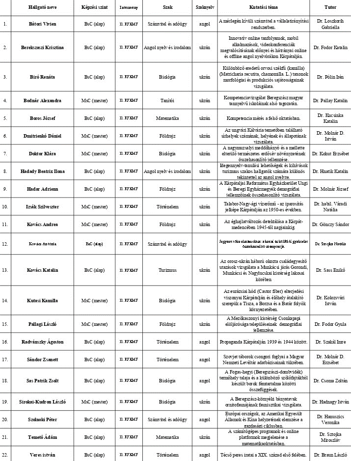 A 24 jelentkező közül 1 személy az Ungvári Nemzeti Egyetem, 23 fő a II. Rákóczi Ferenc Kárpátaljai Magyar Főiskola hallgatója. 15-en alapképzésen és 9-en mesterképzésen vesznek részt, 17-en első alkalommal pályáztak a programba. A vizsgán 22 fő jelent meg.