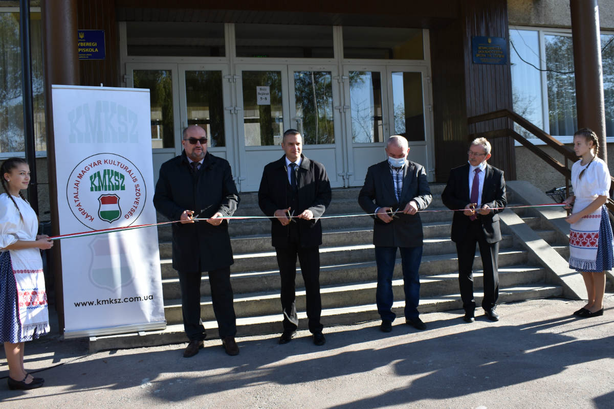 A köszöntők után az iskola ünnepélyes átadásaként Hajgató Tamás, Brenzovics László, Vass Bertalan, a KMKSZ Nagyberegi Alapszervezetének elnöke és Géczi Tihamér elvágták a jelképes szalagot, majd az egyházi méltóságok áldása következett.