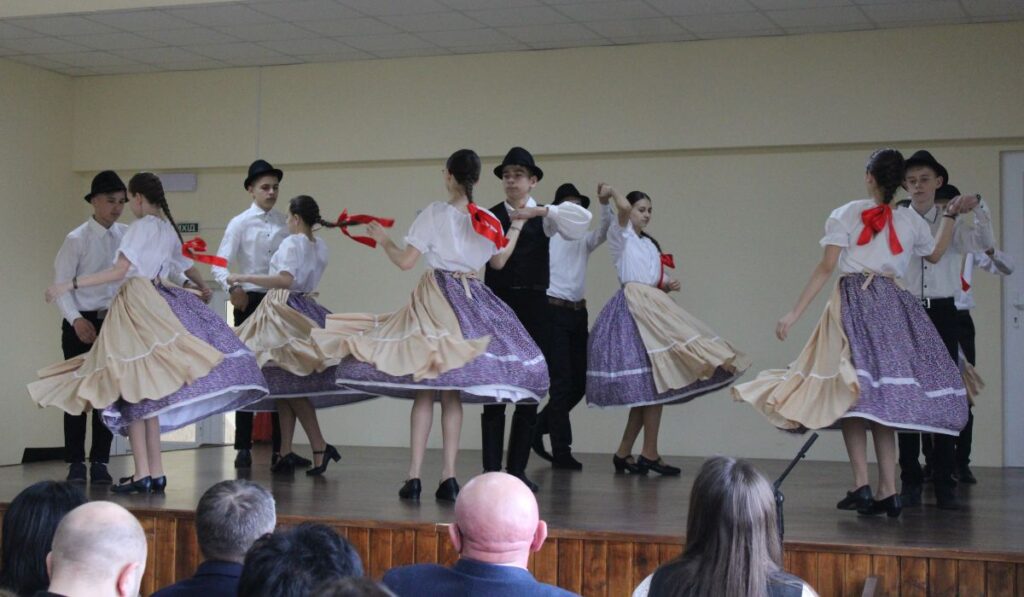 - Az iskola diákjai magyar és ukrán táncokat mutattak be. Előadtak szatmári táncokat és kolészkovát (felkészítőjük Trescsula Mária volt).