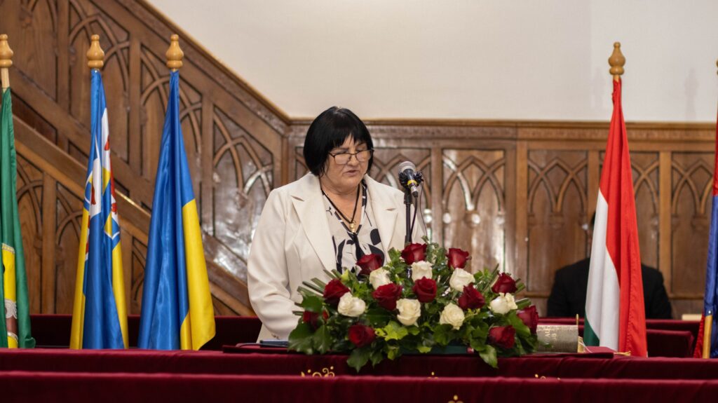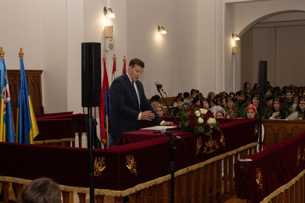 A magyar Himnusz és a II. Rákóczi Ferenc Kárpátaljai Magyar Főiskola himnuszának elhangzása után Csernicskó István, az intézmény rektora köszöntötte a végzős hallgatókat, egyúttal kitért az elmúlt tanév eredményeire is.