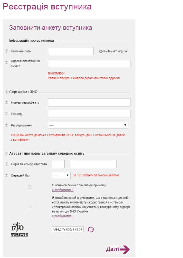 Miután a jelentkező megadta a fenti adatokat, és az oldal alján bejelölte, hogy megismerkedett a felvételi szabályokkal és az elektronikus kérelem benyújtásának feltételeivel, nem kell mást tennie, mint beírni a lap alján található ellenőrző kódot, majd a Tovább (Далі) gombra kattintani.